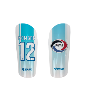 Espinilleras oficiales de Rivas Futsal, personalizables con el número y el nombre.
